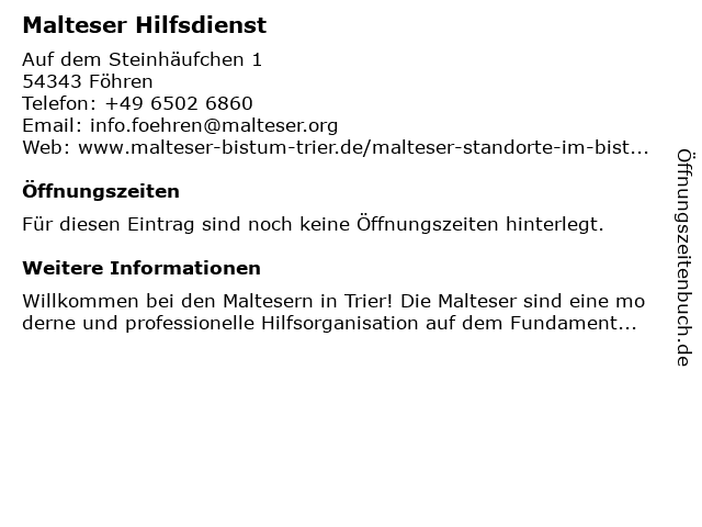 | Öffnungszeiten Malteser Hilfsdienst in Föhren anzeigen | |