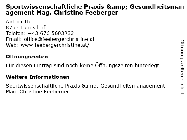 | Sportwissenschaftliche Praxis & Gesundheitsmanagement Mag. Christine Feeberger anrufen | |