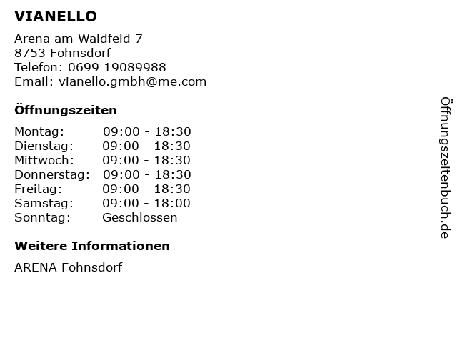 | Öffnungszeiten VIANELLO in Fohnsdorf anzeigen | |