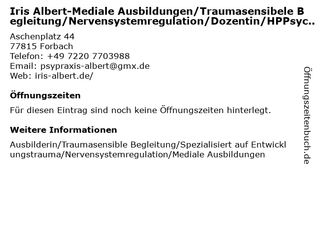 | Iris Albert-Mediale Ausbildungen/Traumasensibele Begleitung/Nervensystemregulation/Dozentin/HPPsychotherapie(HeilprG) anrufen | |