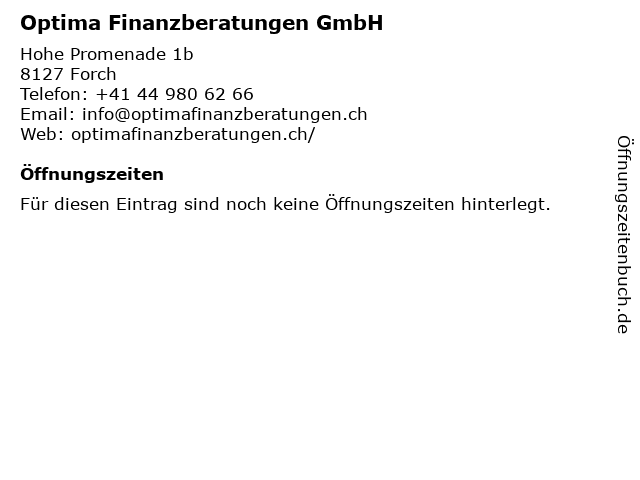 | Öffnungszeiten Optima Finanzberatungen GmbH in Forch anzeigen | |