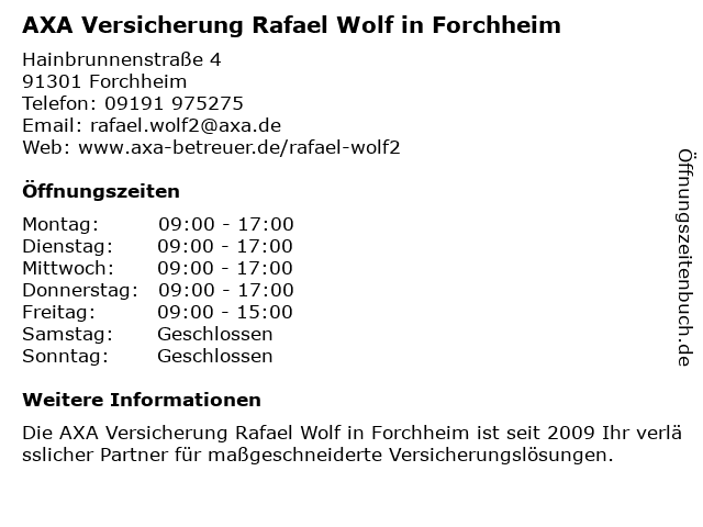 Branchen & Suchbegriffe zu AXA Versicherung Rafael Wolf in Forchheim:altersvorsorge, autoversicherung, axa, berufshaftpflichtversicherung, gebäude- und hausratsversicherung, kfz-versicherung (motorrad), lebensversicherung, rafael, unternehmen für versicherungsfachfragen, versicherung, wolf, zahnmedizinische versicherung |