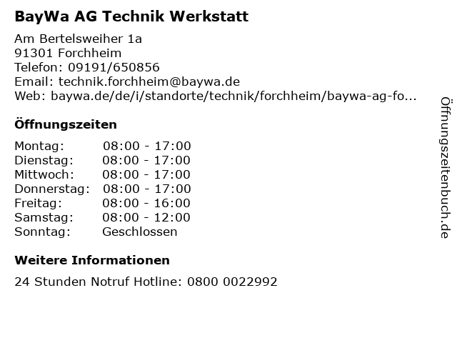 | Öffnungszeiten BayWa AG Technik Werkstatt in Forchheim anzeigen | |