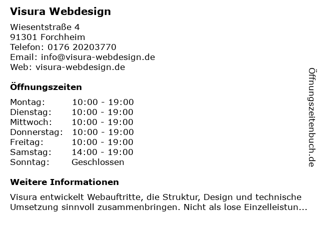 | Öffnungszeiten Visura Webdesign in Forchheim anzeigen | |