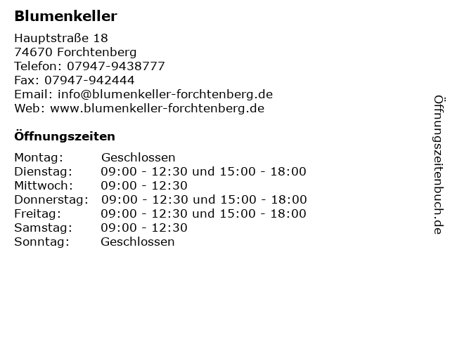| Öffnungszeiten Blumenkeller in Forchtenberg anzeigen | |