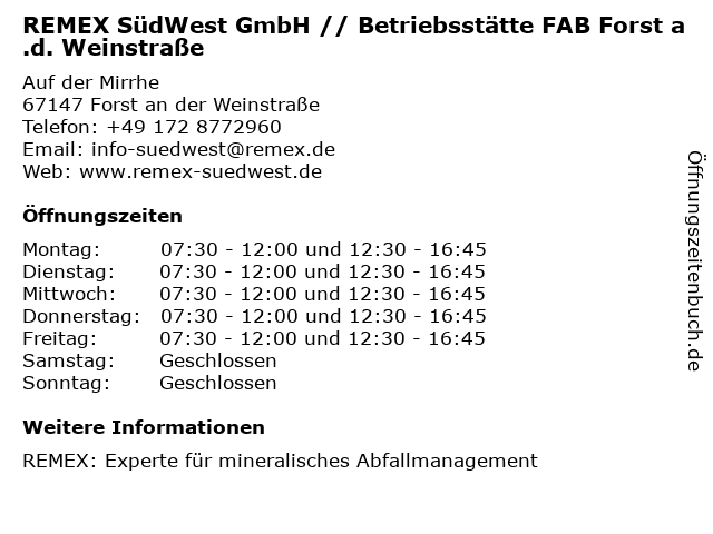 Branchen & Suchbegriffe zu REMEX SüdWest GmbH // Betriebsstätte FAB Forst a.d. Weinstraße://, a.d., bauschutt, baustoffrecycling, betriebsstätte, bodensanierung, deponieersatzbaustoffe, deponiemanagement, fab, flächensanierung, forst, hausmüllverbrennungsasche, mineralstoffentsorgung, recyclingbaustoffe, remex, straßenaufbruch, südwest, weinstraße |