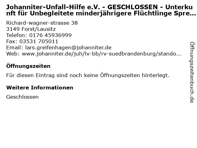 | Johanniter-Unfall-Hilfe e.V. - GESCHLOSSEN - Unterkunft für Unbegleitete minderjährigere Flüchtlinge Spree-Neiße anrufen | |