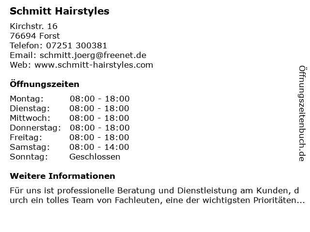 | Öffnungszeiten Schmitt Hairstyles in Forst anzeigen | |
