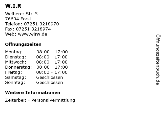 | Öffnungszeiten W.I.R in Forst anzeigen | |