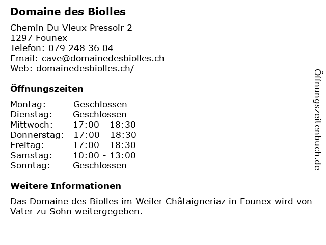 | Öffnungszeiten Domaine des Biolles in Founex anzeigen | |