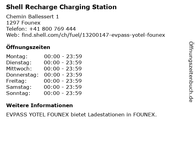 Öffnungszeiten Shell Recharge Charging Station in Founex anzeigen