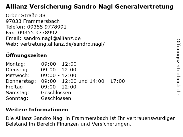 1 Allianz Versicherung Manfred Wenzel Generalvertretung (Entfernung: 8,90 km) Lindenallee 36, 63869 Heigenbrücken 2 Allianz Versicherung Peter Glos Generalvertretung (Entfernung: 10,96 km) Bahnhofstraße 2, 97816 Lohr am Main 3 Allianz Versicherung Sebastian Inderwies Generalvertretung (Entfernung: 10,96 km) Bahnhofstraße 2, 97816 Lohr am Main 4 Allianz Versicherung Volk und Marx GbR Generalvertretung (Entfernung: 15,93 km) Lindenstraße 8, 63825 Schöllkrippen 6 Allianz Versicherung Thomas Brach Generalvertretung (Entfernung: 16,59 km) Baumgartenweg 2 b, 97737 Gemünden am Main |