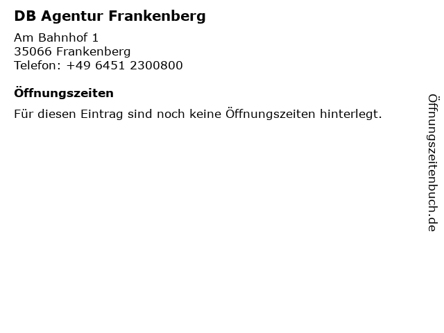 | Telefonnummer DB Agentur Frankenberg in Frankenberg (+49 6451 2300800) anrufen | |