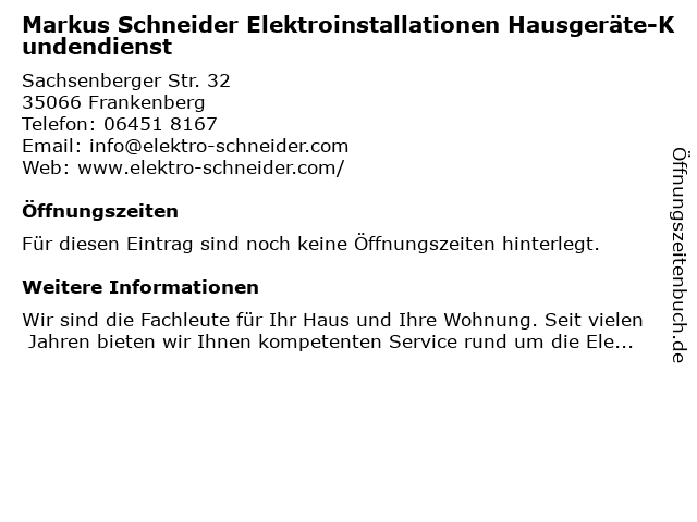 | Markus Schneider Elektroinstallationen Hausgeräte-Kundendienst anrufen | |
