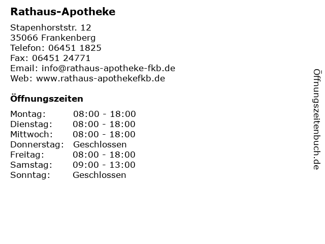 | Öffnungszeiten Rathaus-Apotheke in Frankenberg anzeigen | |