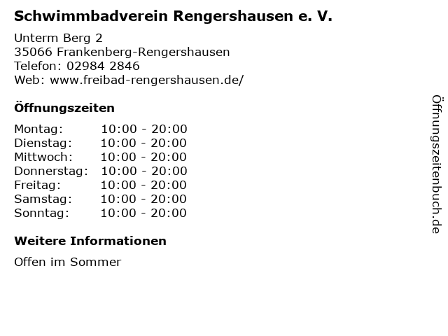 Branchen & Suchbegriffe zu Schwimmbadverein Rengershausen e. V.:bistro, e., freibad, rengershausen, schwimmbadverein, v. |