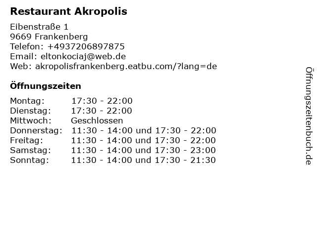| Öffnungszeiten Restaurant Akropolis in Frankenberg anzeigen | |