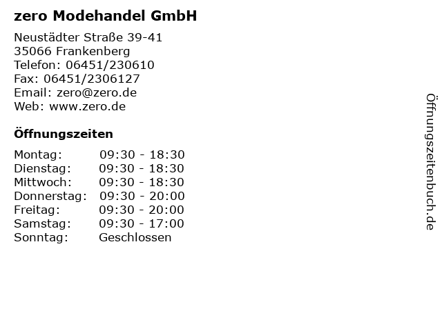 | Öffnungszeiten zero Modehandel GmbH in Frankenberg anzeigen | |