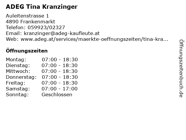 | Öffnungszeiten ADEG Tina Kranzinger in Frankenmarkt anzeigen | |