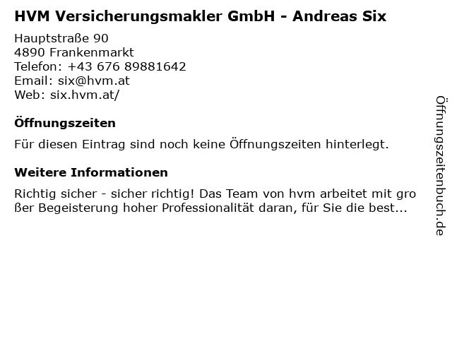 | HVM Versicherungsmakler GmbH - Andreas Six anrufen | |