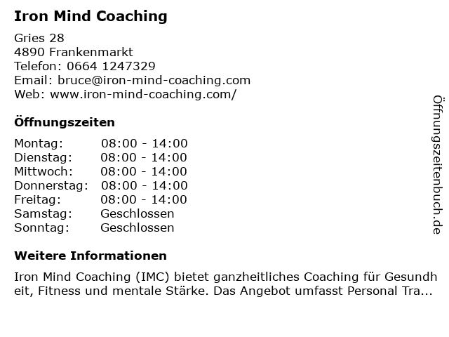 | Öffnungszeiten Iron Mind Coaching in Frankenmarkt anzeigen | |