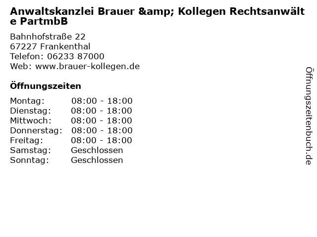1 Anwaltskanzlei Dr. Busch & Kollegen, Rechtsanwälte (Entfernung: 0,05 km) Schlossergasse 4, 67227 Frankenthal 2 Rechtsanwälte Dr.Martin Ohr, Erhard Winter & Kollegen (Entfernung: 0,20 km) Westliche Ringstr. 18, 67227 Frankenthal 6 BKB Brauer, Kwasny, Bayer, Deutsch + Co. GmbH Steuerberatungsgesellschaft Wirtschaftsprüfungsgesellschaft (Entfernung: 9,98 km) Paul-Klee-Straße 1, 67061 Ludwigshafen |
