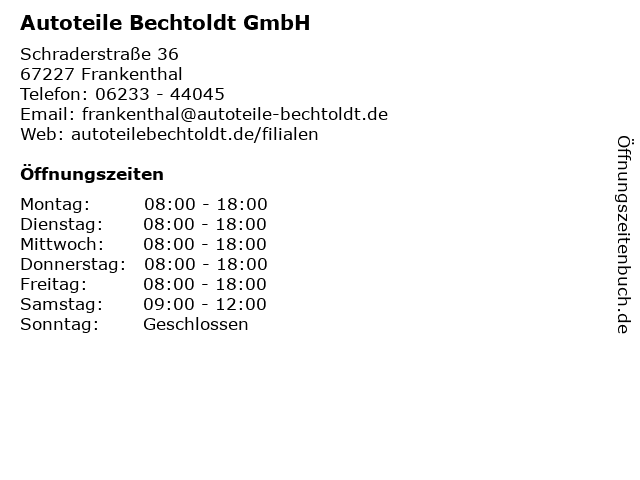 | Öffnungszeiten Autoteile Bechtoldt GmbH in Frankenthal anzeigen | |