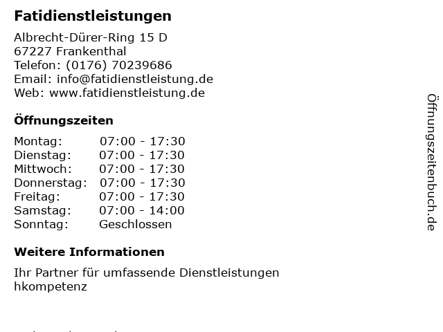 | Öffnungszeiten Fatidienstleistungen in Frankenthal anzeigen | |