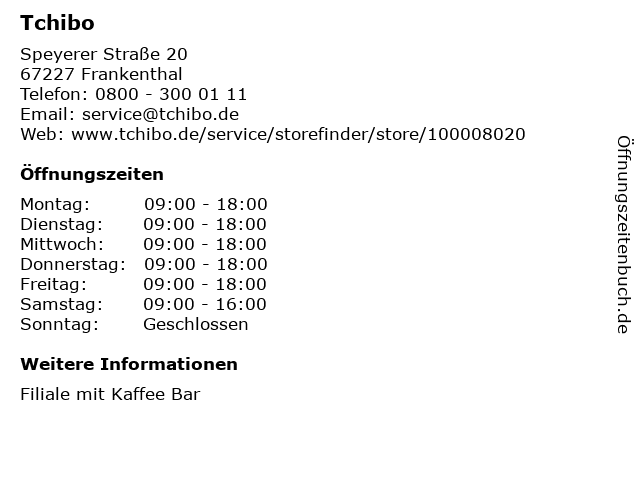 | Öffnungszeiten Tchibo in Frankenthal anzeigen | |
