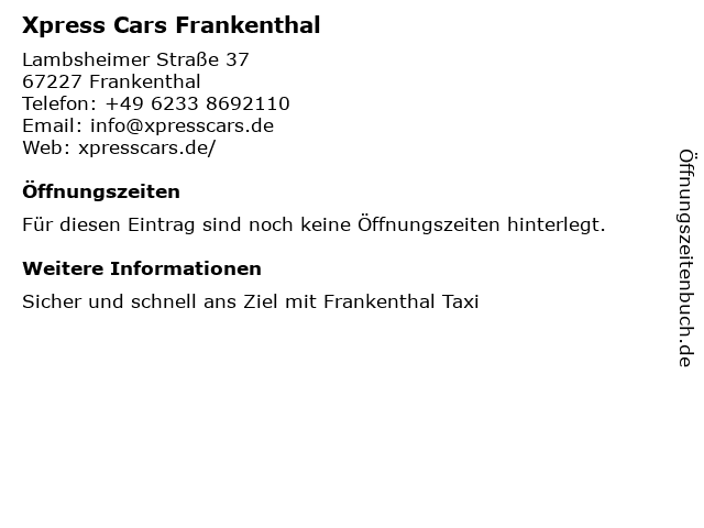 | Öffnungszeiten Xpress Cars Frankenthal in Frankenthal anzeigen | |