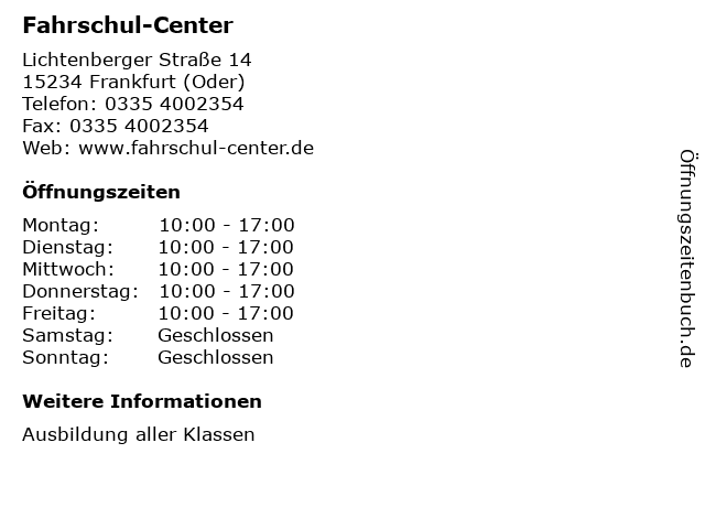 | Öffnungszeiten Fahrschul-Center in Frankfurt (Oder) anzeigen | |