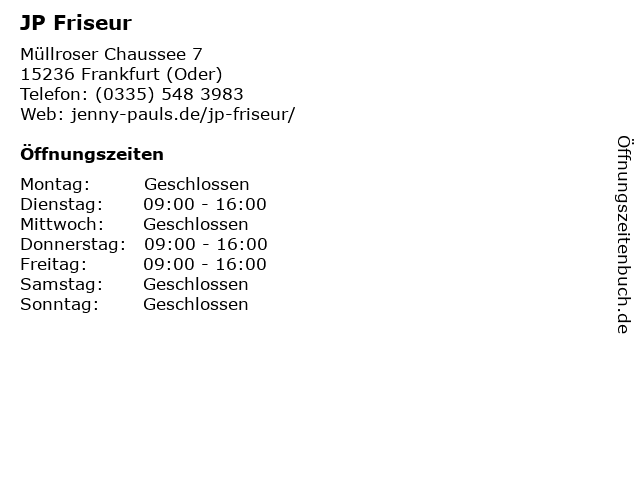 | Öffnungszeiten JP Friseur in Frankfurt (Oder) anzeigen | |