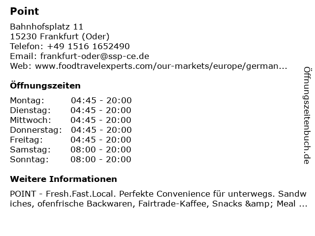 | Öffnungszeiten Point in Frankfurt (Oder) anzeigen | |
