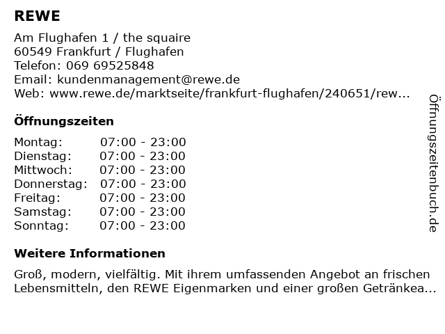 | Öffnungszeiten REWE in Frankfurt / Flughafen anzeigen | |