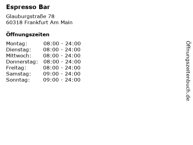 | Öffnungszeiten Espresso Bar in Frankfurt Am Main anzeigen | |