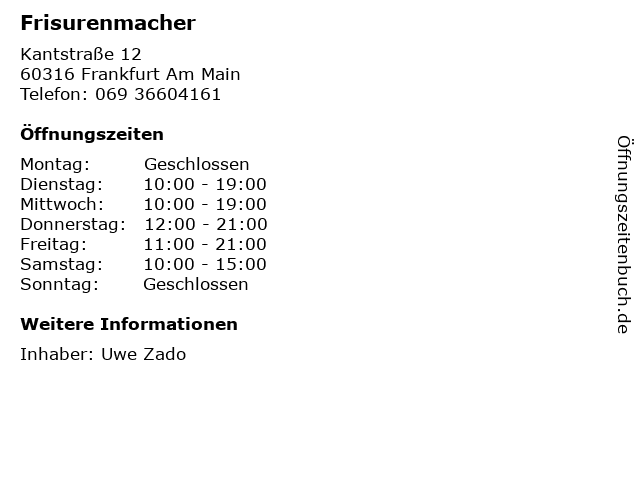 | Öffnungszeiten Frisurenmacher in Frankfurt Am Main anzeigen | |