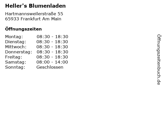 | Öffnungszeiten Heller's Blumenladen in Frankfurt Am Main anzeigen | |