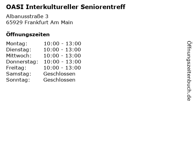 | Öffnungszeiten OASI Interkultureller Seniorentreff in Frankfurt Am Main anzeigen | |
