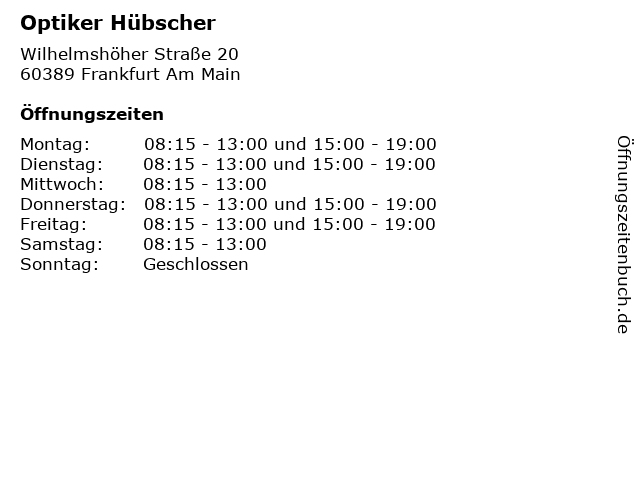 | Öffnungszeiten Optiker Hübscher in Frankfurt Am Main anzeigen | |