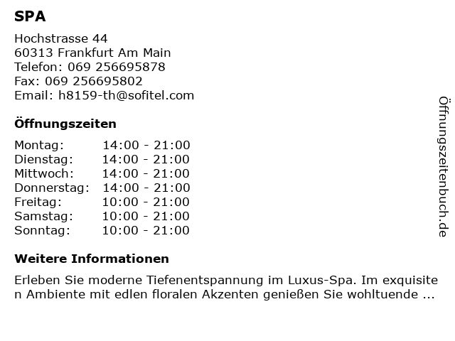 | Öffnungszeiten SPA in Frankfurt Am Main anzeigen | |