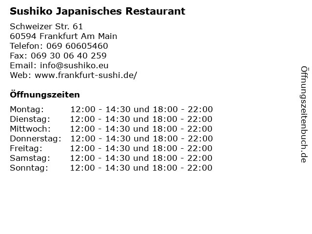 4 Sushimoto Japanisches Spezialitäten-Restaurant GmbH (Entfernung: 1,67 km) Konrad-Adenauer-Straße 7, 60313 Frankfurt am Main 5 Sushimoto Japanisches Spezialitäten-Restaurant GmbH (Entfernung: 1,67 km) Konrad-Adenauer-Str. 7, 60313 Frankfurt 6 |