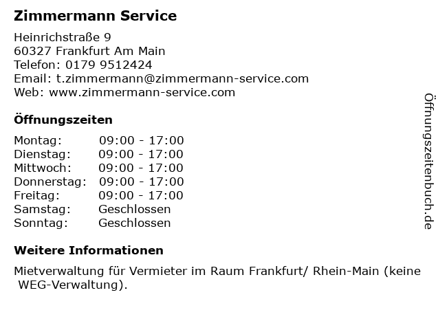 | Öffnungszeiten Zimmermann Service in Frankfurt Am Main anzeigen | |