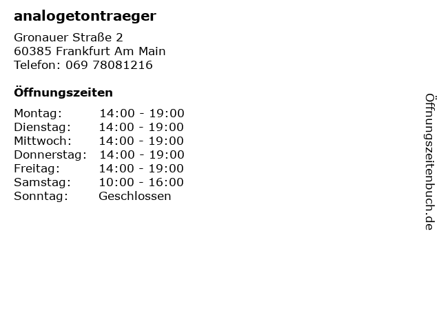| Öffnungszeiten analogetontraeger in Frankfurt Am Main anzeigen | |