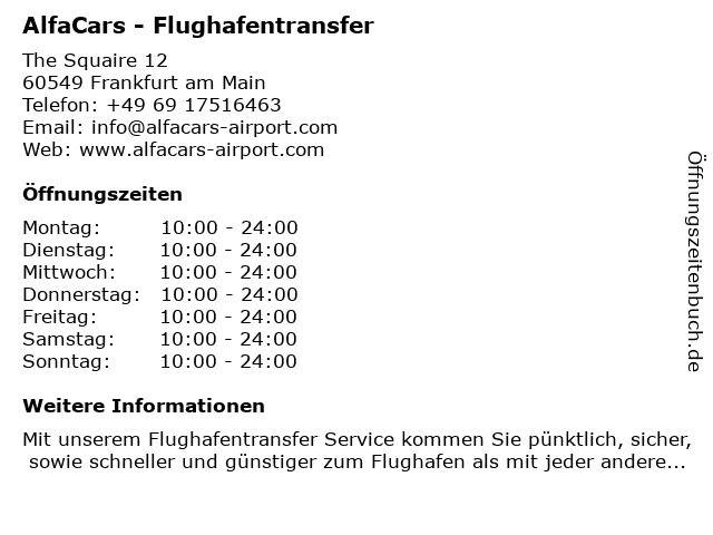 Branchen & Suchbegriffe zu AlfaCars - Flughafentransfer:alfacars, flexibles reisen, flughafen transfer, flughafentransfer, frankfurt airport, frankfurt airport transfer, frankfurt flughafen transfer, garantierte festpreise, günstiger als taxi, personenbeförderung, sichere fahrten, stressfreie flugreisen |