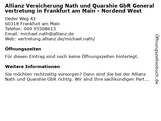 Öffnungszeiten Allianz Versicherung Nath und Quarshie GbR Generalvertretung in Frankfurt am Main - Nordend West
