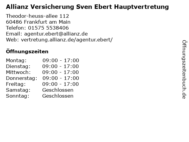 1 Koss, Sven Dipl.-Ing Beratender Ingenieur ö.b.u.v. Sachverständiger für Heizungsanlagen (Entfernung: 0,03 km) Theodor-Heuss-Allee 112, 60486 Frankfurt am Main 3 Wolfgang Ebert Grundstücksverwaltung Immobilien (Entfernung: 1,28 km) Idsteiner Str. 51, 60326 Frankfurt 4 5 Allianz Hauptvertretung Allianz Tippelt Frankfurt (Entfernung: 1,57 km) Falkstr. 24, 60487 Frankfurt am Main 6 |