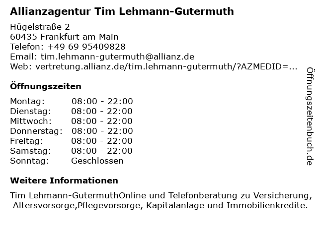 1 Allianz Versicherung Tim Lehmann-Gutermuth Hauptvertretung (Entfernung: 0,00 km) Hügelstraße 2, 60435 Frankfurt am Main 6 |
