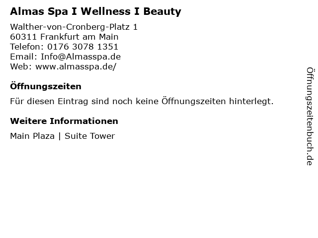 1 Lindner Hotel & Residence Main Plaza | Spa (Entfernung: 0,00 km) Walther-von-Cronberg-Platz 1, 60594 Frankfurt 2 River Wellness Health & Beauty Wellnesspraxis (Entfernung: 0,19 km) Zum Apothekerhof 8, 60594 Frankfurt 6 |