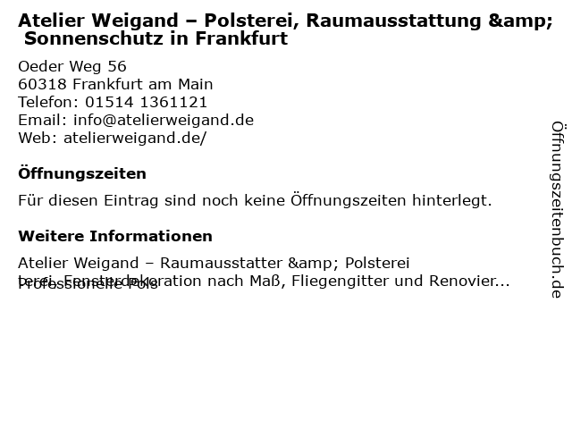 Atelier Weigand – Polsterei, Raumausstattung & Sonnenschutz in Frankfurt anrufen | |