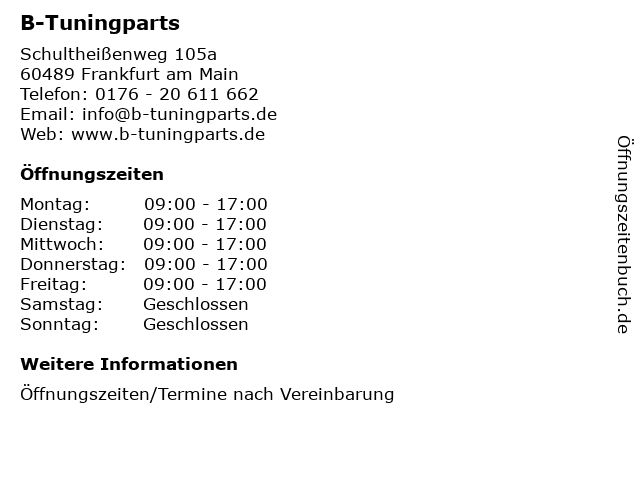 | Öffnungszeiten B-Tuningparts in Frankfurt am Main anzeigen | |